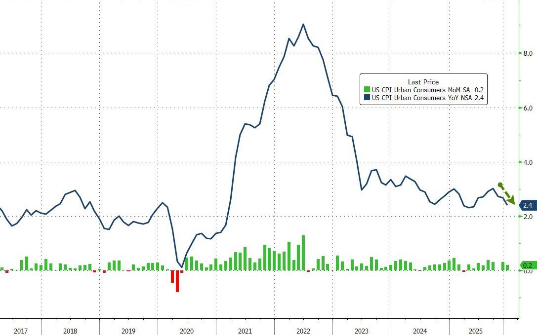 具体数据显示,美国1月未季调CPI年率录得2.4%,创2025年5月以来新低,低于市场预期的2.5%;1月季调后CPI月率录得0.2%,低于预期的0.3%,前值为0.3%。
